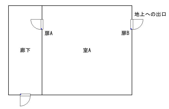 つまり、いずれかの扉が地上へ通じていれば全ての扉の有効流動係数=90人/分・mとなり、最も効率よく避難が行われます。下図の例では扉Bが地上への出口なので、有効流動係数は扉A・扉B共に90人/分・mとなります。![]()
