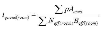 Σが見慣れない使い方をされていますが、計算自体はシンプルです。分子=「在室者数」を、分母=「1分当たりに出口を通過できる人数」で除することで、全ての在室者が室出口を通過する時間を算出するだけです。ひとつひとつ丁寧に読み解いていきましょう。