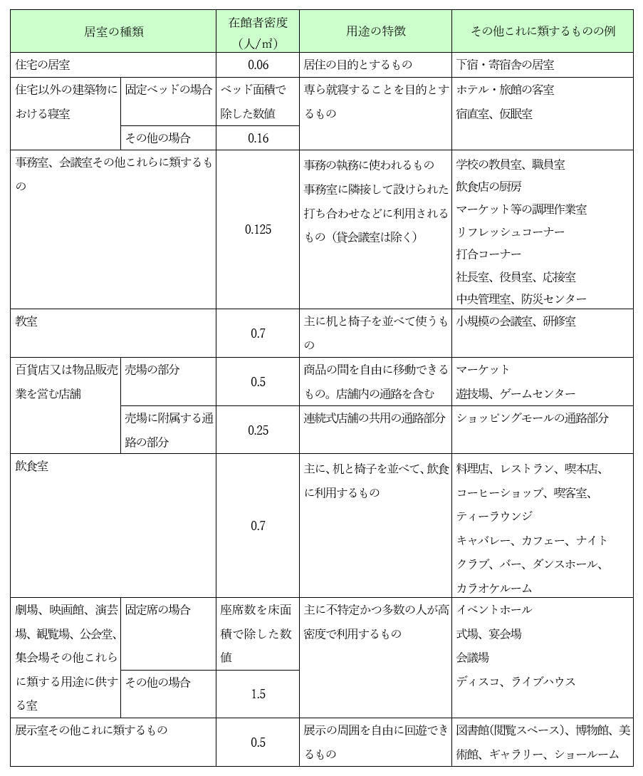 建築物の部分の種類に応じ、それぞれ次の表に定める在館者密度(単位 人/㎡)
