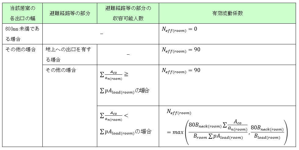 当該居室の各出口の幅、当該居室の種類及び当該居室の各出口に面する部分(以下「居室避難経路等の部分」という。)の収容可能人数に応じ、それぞれ次の表に掲げる式によって計算した当該居室の各出口の有効流動係数(単位 人/分・m)