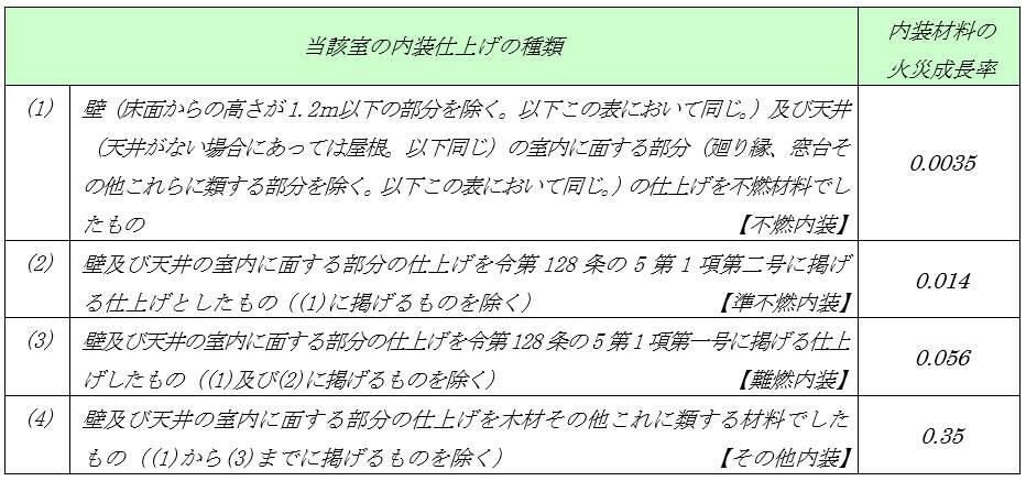 当該室の内装仕上げの種類に応じ、それぞれ次の表に定める内装材の火災成長率![]()