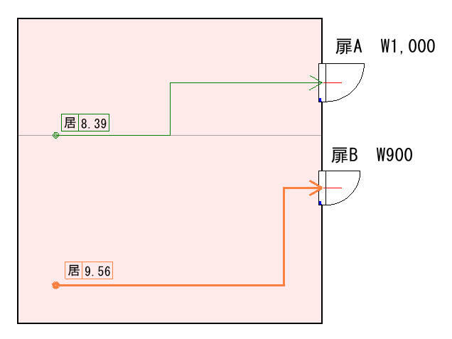 以下の例では、有効出口幅の計算は最大扉幅の扉Aについて行いますが、ttravel(room)は、最も長い経路となる扉Bに向かう経路を用いて計算します。![]()