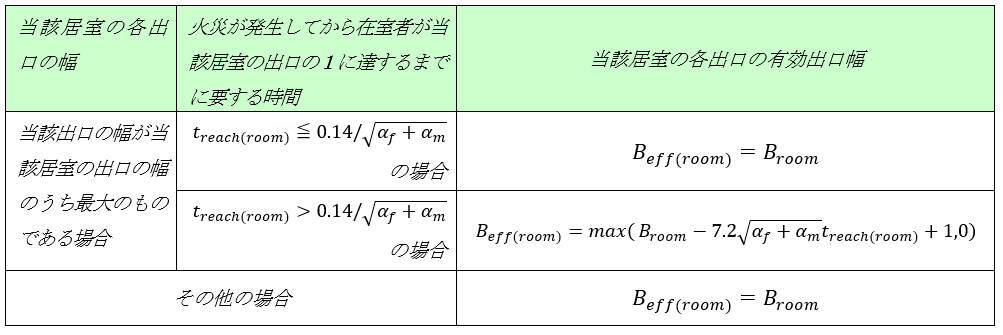 当該居室の各出口の幅及び火災が発生してから在室者が当該居室の出口の1に達するまでに要する時間に応じ、それぞれ次の表に掲げる式によって計算した当該居室の各出口に有効出口幅(単位 m)![]()