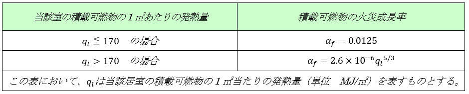 当該居室の積載可燃物の1㎡当たりの発熱量に応じ、それぞれ次の表に掲げる式によって計算した積載可燃物の火災成長率![]()